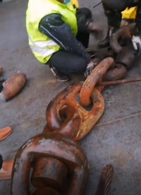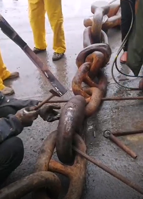 4、用專用機器夾住惰鏈,再用錨機把惰鏈放出擺在甲板上,等到另外的連接鏈環放到甲板上。