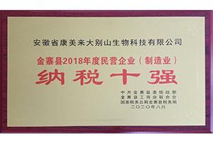 榮獲:金寨縣2018年度民營企業(yè)(制造業(yè))“納稅十強”稱號