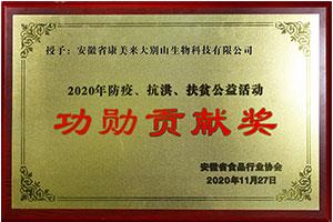 榮獲:安徽省食品行業(yè)2020年防疫、抗洪、扶貧公益活動“功勛貢獻獎”